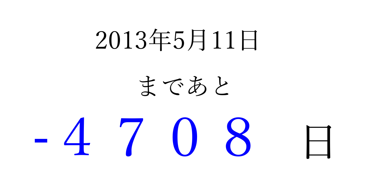 2013年5月11日(土)は もう 0000 日過ぎました 追加すると、トップページからすぐ選べるようになります ※2026/04/01現在の結果です。 最新の状態に更新する ↓シェアして、タイムライン上にカウントダウンを表示しよう!↓ 📤 この結果を共有する Tweet シェア Threads Bluesky 別の日付でカウントダウン 2013年5月のカレンダー このページをブックマークに追加すると、いつでもカウントダウンを確認できます。 (PC: Ctrl+D / Mac: ⌘+D) hitome-notes.comでは以下のページも運営しています。 指定日と期間から日付を計算 | ガチャ確率計算・シミュレーション | プライバシー・ポリシー 運営者:Avocado