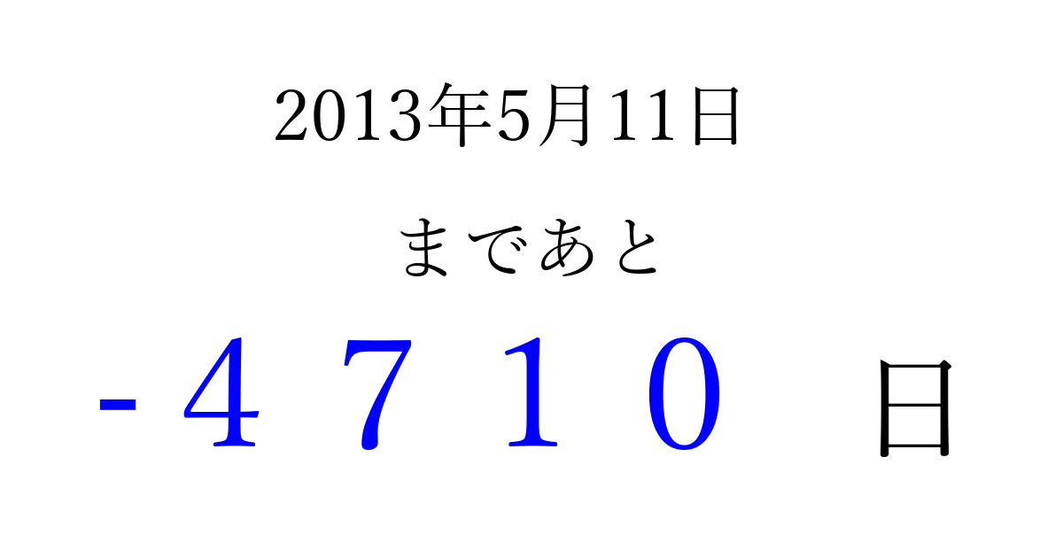 2013年5月11日(土)は もう 0000 日過ぎました 追加すると、トップページからすぐ選べるようになります ※2026/04/03現在の結果です。 最新の状態に更新する ↓シェアして、タイムライン上にカウントダウンを表示しよう!↓ 📤 この結果を共有する Tweet シェア Threads Bluesky 別の日付でカウントダウン 2013年5月のカレンダー このページをブックマークに追加すると、いつでもカウントダウンを確認できます。 (PC: Ctrl+D / Mac: ⌘+D) hitome-notes.comでは以下のページも運営しています。 指定日と期間から日付を計算 | ガチャ確率計算・シミュレーション | プライバシー・ポリシー 運営者:Avocado