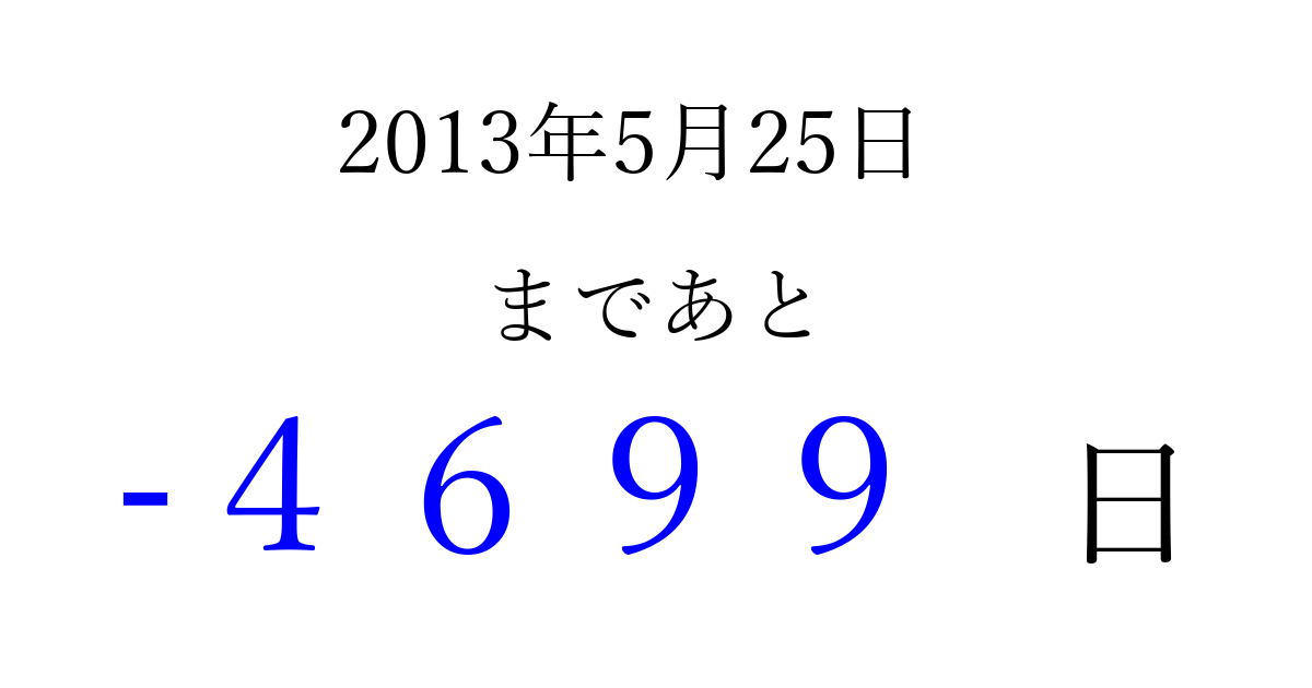 2013年5月25日(土)は もう 0000 日過ぎました 追加すると、トップページからすぐ選べるようになります ※2026/04/06現在の結果です。 最新の状態に更新する ↓シェアして、タイムライン上にカウントダウンを表示しよう!↓ 📤 この結果を共有する Tweet シェア Threads Bluesky 別の日付でカウントダウン 2013年5月のカレンダー このページをブックマークに追加すると、いつでもカウントダウンを確認できます。 (PC: Ctrl+D / Mac: ⌘+D) hitome-notes.comでは以下のページも運営しています。 指定日と期間から日付を計算 | ガチャ確率計算・シミュレーション | プライバシー・ポリシー 運営者:Avocado