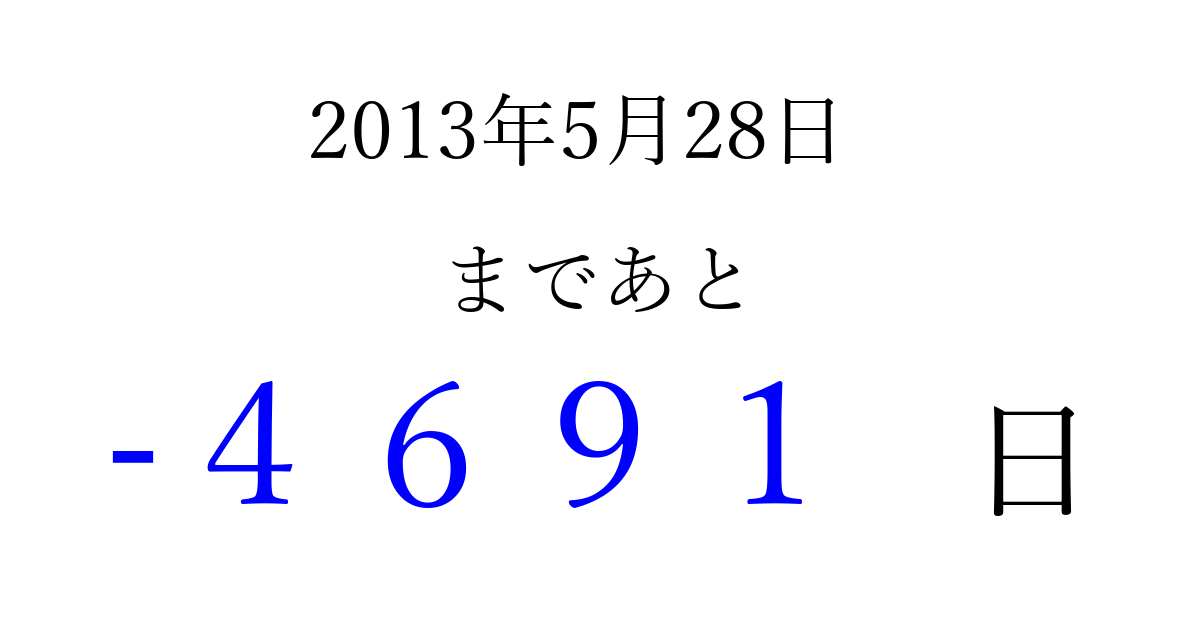 2013年5月28日(火)は もう 0000 日過ぎました 追加すると、トップページからすぐ選べるようになります ※2026/04/01現在の結果です。 最新の状態に更新する ↓シェアして、タイムライン上にカウントダウンを表示しよう!↓ 📤 この結果を共有する Tweet シェア Threads Bluesky 別の日付でカウントダウン 2013年5月のカレンダー このページをブックマークに追加すると、いつでもカウントダウンを確認できます。 (PC: Ctrl+D / Mac: ⌘+D) hitome-notes.comでは以下のページも運営しています。 指定日と期間から日付を計算 | ガチャ確率計算・シミュレーション | プライバシー・ポリシー 運営者:Avocado