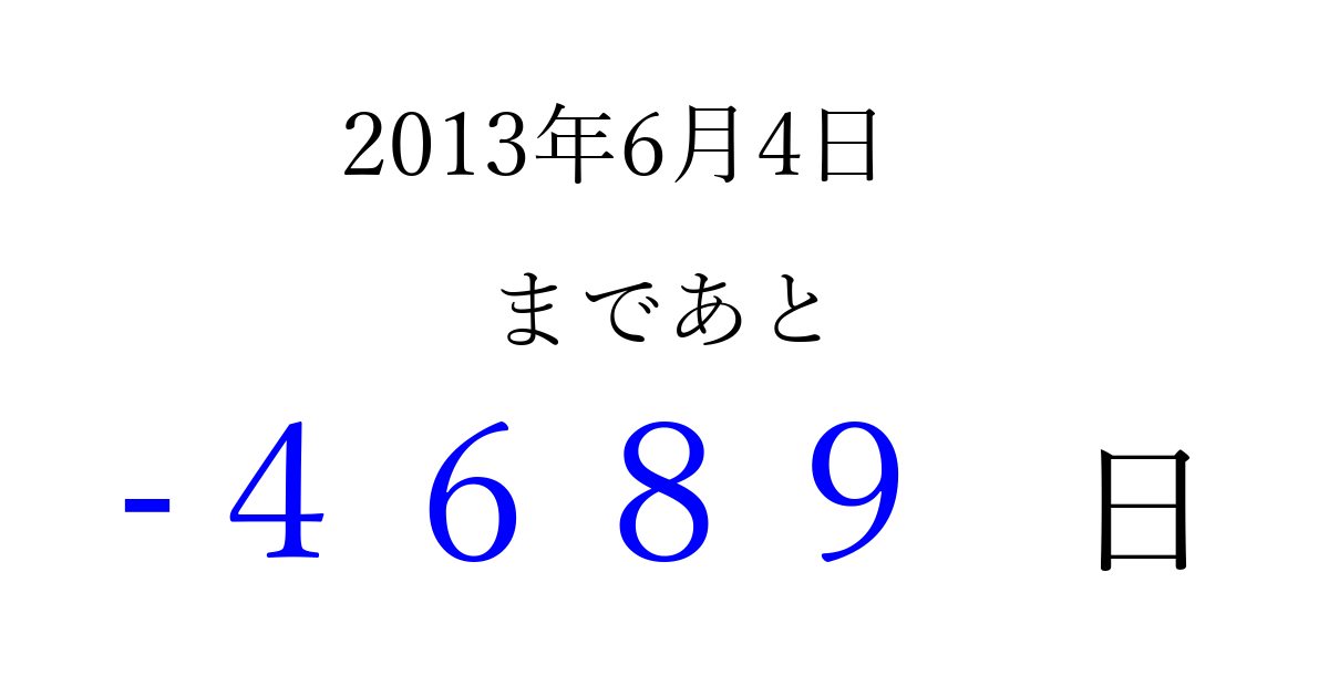 2013年6月4日(火)は もう 0000 日過ぎました 追加すると、トップページからすぐ選べるようになります ※2026/04/06現在の結果です。 最新の状態に更新する ↓シェアして、タイムライン上にカウントダウンを表示しよう!↓ 📤 この結果を共有する Tweet シェア Threads Bluesky 別の日付でカウントダウン 2013年6月のカレンダー このページをブックマークに追加すると、いつでもカウントダウンを確認できます。 (PC: Ctrl+D / Mac: ⌘+D) hitome-notes.comでは以下のページも運営しています。 指定日と期間から日付を計算 | ガチャ確率計算・シミュレーション | プライバシー・ポリシー 運営者:Avocado