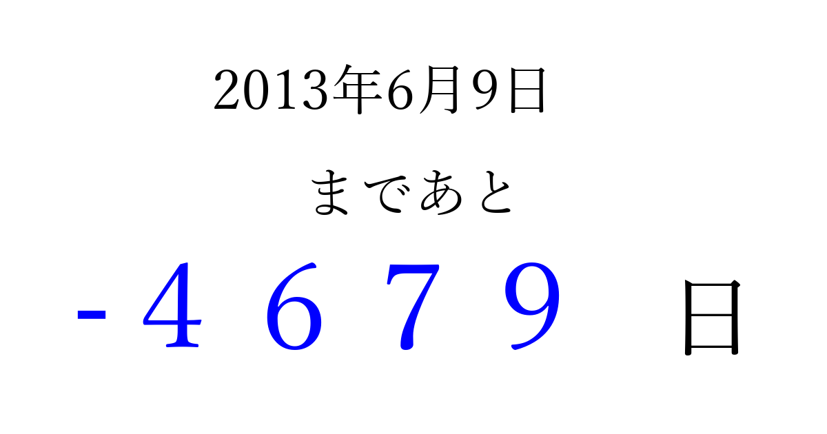 2013年6月9日(日)は もう 0000 日過ぎました 追加すると、トップページからすぐ選べるようになります ※2026/04/01現在の結果です。 最新の状態に更新する ↓シェアして、タイムライン上にカウントダウンを表示しよう!↓ 📤 この結果を共有する Tweet シェア Threads Bluesky 別の日付でカウントダウン 2013年6月のカレンダー このページをブックマークに追加すると、いつでもカウントダウンを確認できます。 (PC: Ctrl+D / Mac: ⌘+D) hitome-notes.comでは以下のページも運営しています。 指定日と期間から日付を計算 | ガチャ確率計算・シミュレーション | プライバシー・ポリシー 運営者:Avocado