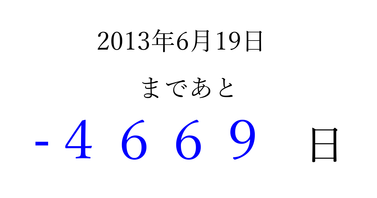 2013年6月19日(水)は もう 0000 日過ぎました 追加すると、トップページからすぐ選べるようになります ※2026/04/01現在の結果です。 最新の状態に更新する ↓シェアして、タイムライン上にカウントダウンを表示しよう!↓ 📤 この結果を共有する Tweet シェア Threads Bluesky 別の日付でカウントダウン 2013年6月のカレンダー このページをブックマークに追加すると、いつでもカウントダウンを確認できます。 (PC: Ctrl+D / Mac: ⌘+D) hitome-notes.comでは以下のページも運営しています。 指定日と期間から日付を計算 | ガチャ確率計算・シミュレーション | プライバシー・ポリシー 運営者:Avocado