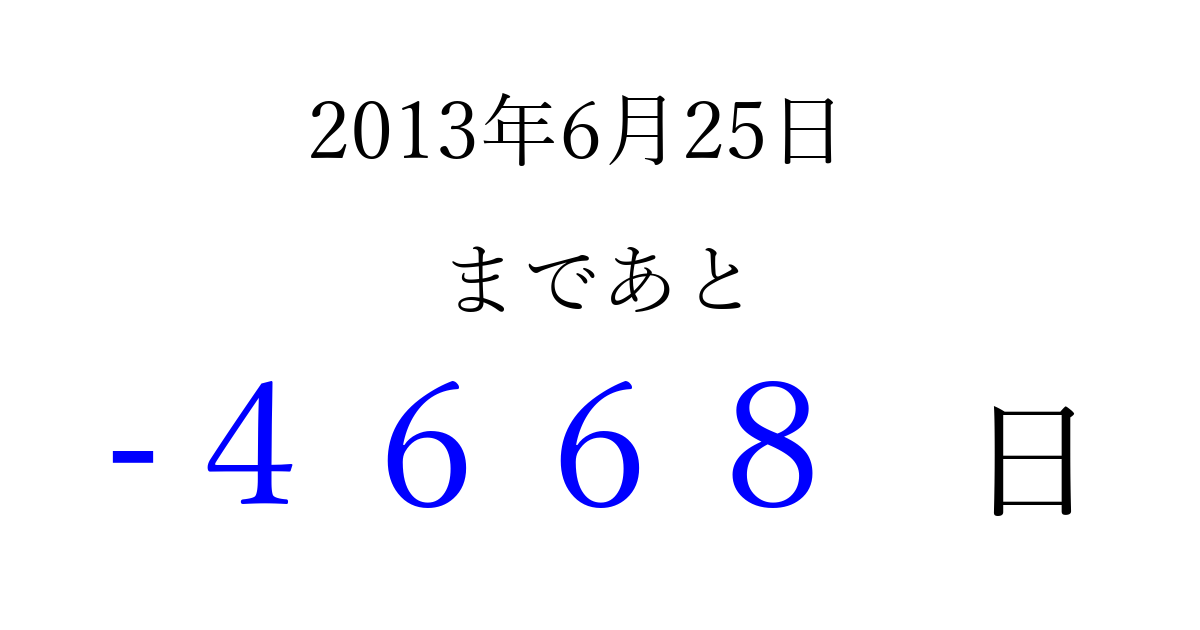 2013年6月25日(火)は もう 0000 日過ぎました 追加すると、トップページからすぐ選べるようになります ※2026/04/06現在の結果です。 最新の状態に更新する ↓シェアして、タイムライン上にカウントダウンを表示しよう!↓ 📤 この結果を共有する Tweet シェア Threads Bluesky 別の日付でカウントダウン 2013年6月のカレンダー このページをブックマークに追加すると、いつでもカウントダウンを確認できます。 (PC: Ctrl+D / Mac: ⌘+D) hitome-notes.comでは以下のページも運営しています。 指定日と期間から日付を計算 | ガチャ確率計算・シミュレーション | プライバシー・ポリシー 運営者:Avocado