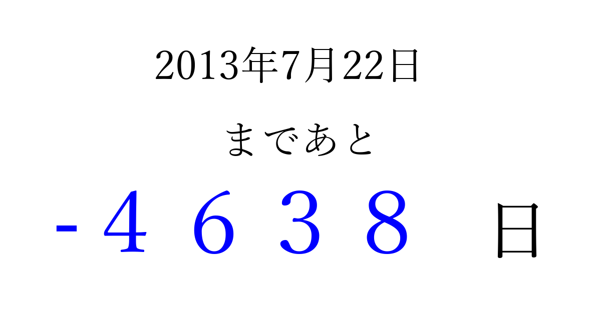2013年7月22日(月)は もう 0000 日過ぎました 追加すると、トップページからすぐ選べるようになります ※2026/04/03現在の結果です。 最新の状態に更新する ↓シェアして、タイムライン上にカウントダウンを表示しよう!↓ 📤 この結果を共有する Tweet シェア Threads Bluesky 別の日付でカウントダウン 2013年7月のカレンダー このページをブックマークに追加すると、いつでもカウントダウンを確認できます。 (PC: Ctrl+D / Mac: ⌘+D) hitome-notes.comでは以下のページも運営しています。 指定日と期間から日付を計算 | ガチャ確率計算・シミュレーション | プライバシー・ポリシー 運営者:Avocado