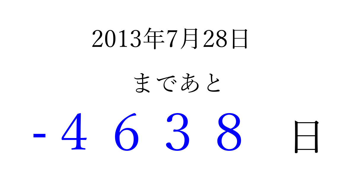 2013年7月28日(日)は もう 0000 日過ぎました 追加すると、トップページからすぐ選べるようになります ※2026/04/09現在の結果です。 最新の状態に更新する ↓シェアして、タイムライン上にカウントダウンを表示しよう!↓ 📤 この結果を共有する Tweet シェア Threads Bluesky 別の日付でカウントダウン 2013年7月のカレンダー このページをブックマークに追加すると、いつでもカウントダウンを確認できます。 (PC: Ctrl+D / Mac: ⌘+D) hitome-notes.comでは以下のページも運営しています。 指定日と期間から日付を計算 | ガチャ確率計算・シミュレーション | プライバシー・ポリシー 運営者:Avocado