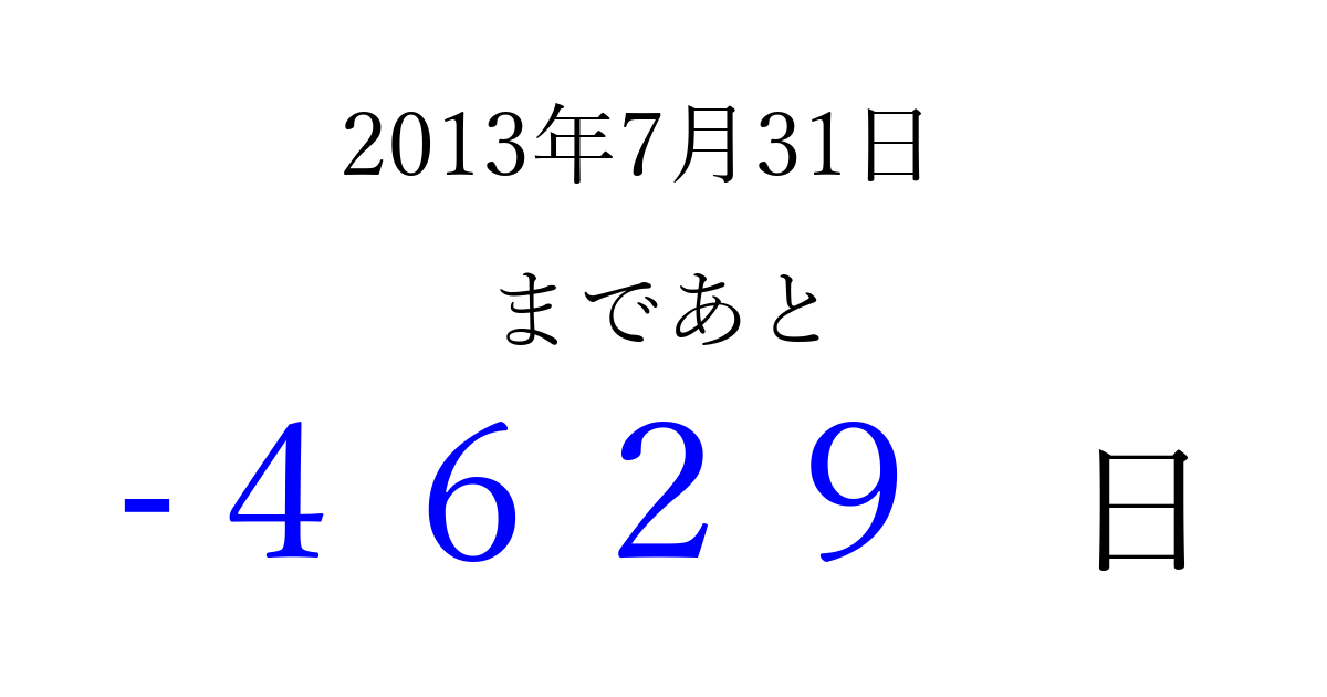 2013年7月31日(水)は もう 0000 日過ぎました 追加すると、トップページからすぐ選べるようになります ※2026/04/03現在の結果です。 最新の状態に更新する ↓シェアして、タイムライン上にカウントダウンを表示しよう!↓ 📤 この結果を共有する Tweet シェア Threads Bluesky 別の日付でカウントダウン 2013年7月のカレンダー このページをブックマークに追加すると、いつでもカウントダウンを確認できます。 (PC: Ctrl+D / Mac: ⌘+D) hitome-notes.comでは以下のページも運営しています。 指定日と期間から日付を計算 | ガチャ確率計算・シミュレーション | プライバシー・ポリシー 運営者:Avocado