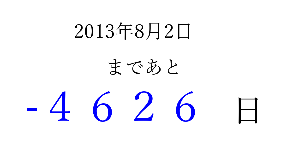 2013年8月2日(金)は もう 0000 日過ぎました 追加すると、トップページからすぐ選べるようになります ※2026/04/02現在の結果です。 最新の状態に更新する ↓シェアして、タイムライン上にカウントダウンを表示しよう!↓ 📤 この結果を共有する Tweet シェア Threads Bluesky 別の日付でカウントダウン 2013年8月のカレンダー このページをブックマークに追加すると、いつでもカウントダウンを確認できます。 (PC: Ctrl+D / Mac: ⌘+D) hitome-notes.comでは以下のページも運営しています。 指定日と期間から日付を計算 | ガチャ確率計算・シミュレーション | プライバシー・ポリシー 運営者:Avocado