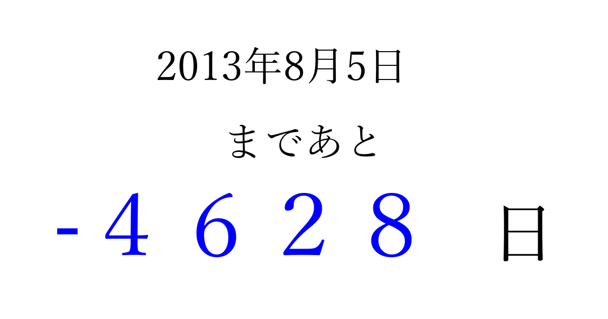 2013年8月5日(月)は もう 0000 日過ぎました 追加すると、トップページからすぐ選べるようになります ※2026/04/07現在の結果です。 最新の状態に更新する ↓シェアして、タイムライン上にカウントダウンを表示しよう!↓ 📤 この結果を共有する Tweet シェア Threads Bluesky 別の日付でカウントダウン 2013年8月のカレンダー このページをブックマークに追加すると、いつでもカウントダウンを確認できます。 (PC: Ctrl+D / Mac: ⌘+D) hitome-notes.comでは以下のページも運営しています。 指定日と期間から日付を計算 | ガチャ確率計算・シミュレーション | プライバシー・ポリシー 運営者:Avocado