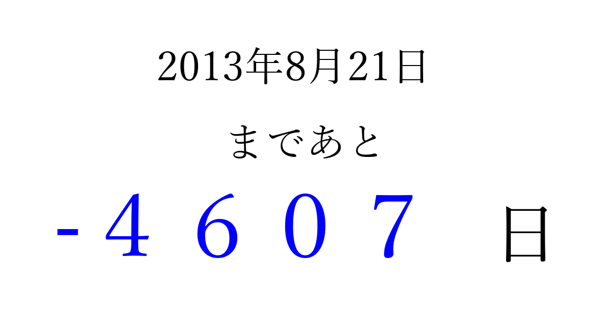 2013年8月21日(水)は もう 0000 日過ぎました 追加すると、トップページからすぐ選べるようになります ※2026/04/02現在の結果です。 最新の状態に更新する ↓シェアして、タイムライン上にカウントダウンを表示しよう!↓ 📤 この結果を共有する Tweet シェア Threads Bluesky 別の日付でカウントダウン 2013年8月のカレンダー このページをブックマークに追加すると、いつでもカウントダウンを確認できます。 (PC: Ctrl+D / Mac: ⌘+D) hitome-notes.comでは以下のページも運営しています。 指定日と期間から日付を計算 | ガチャ確率計算・シミュレーション | プライバシー・ポリシー 運営者:Avocado