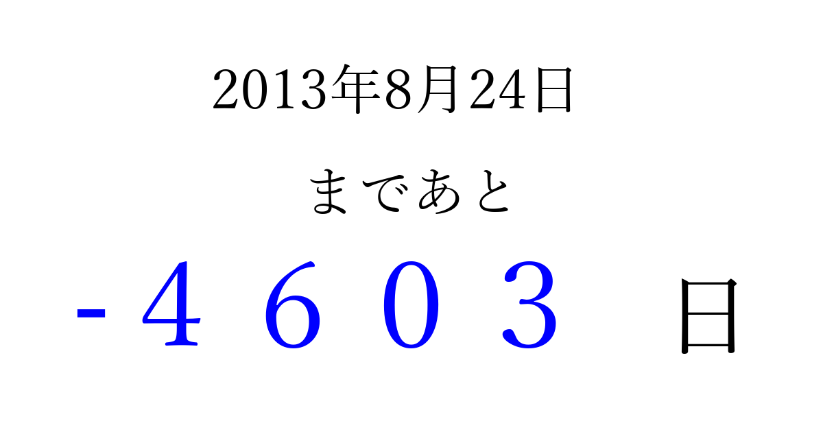 2013年8月24日(土)は もう 0000 日過ぎました 追加すると、トップページからすぐ選べるようになります ※2026/04/01現在の結果です。 最新の状態に更新する ↓シェアして、タイムライン上にカウントダウンを表示しよう!↓ 📤 この結果を共有する Tweet シェア Threads Bluesky 別の日付でカウントダウン 2013年8月のカレンダー このページをブックマークに追加すると、いつでもカウントダウンを確認できます。 (PC: Ctrl+D / Mac: ⌘+D) hitome-notes.comでは以下のページも運営しています。 指定日と期間から日付を計算 | ガチャ確率計算・シミュレーション | プライバシー・ポリシー 運営者:Avocado