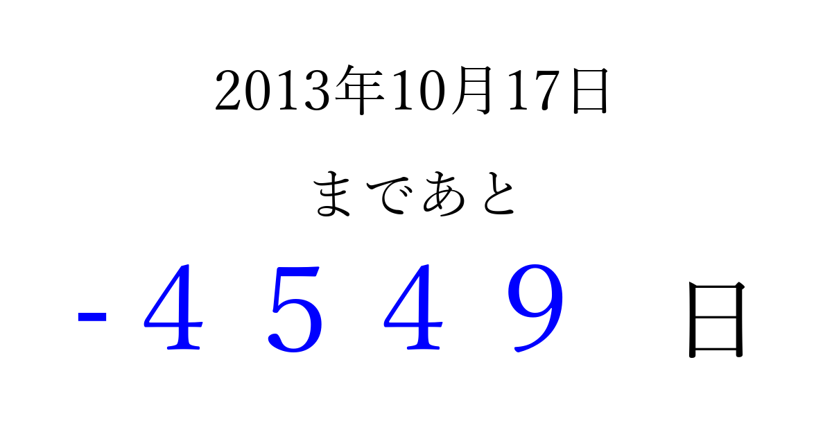 2013年10月17日(木)は もう 0000 日過ぎました 追加すると、トップページからすぐ選べるようになります ※2026/04/01現在の結果です。 最新の状態に更新する ↓シェアして、タイムライン上にカウントダウンを表示しよう!↓ 📤 この結果を共有する Tweet シェア Threads Bluesky 別の日付でカウントダウン 2013年10月のカレンダー このページをブックマークに追加すると、いつでもカウントダウンを確認できます。 (PC: Ctrl+D / Mac: ⌘+D) hitome-notes.comでは以下のページも運営しています。 指定日と期間から日付を計算 | ガチャ確率計算・シミュレーション | プライバシー・ポリシー 運営者:Avocado
