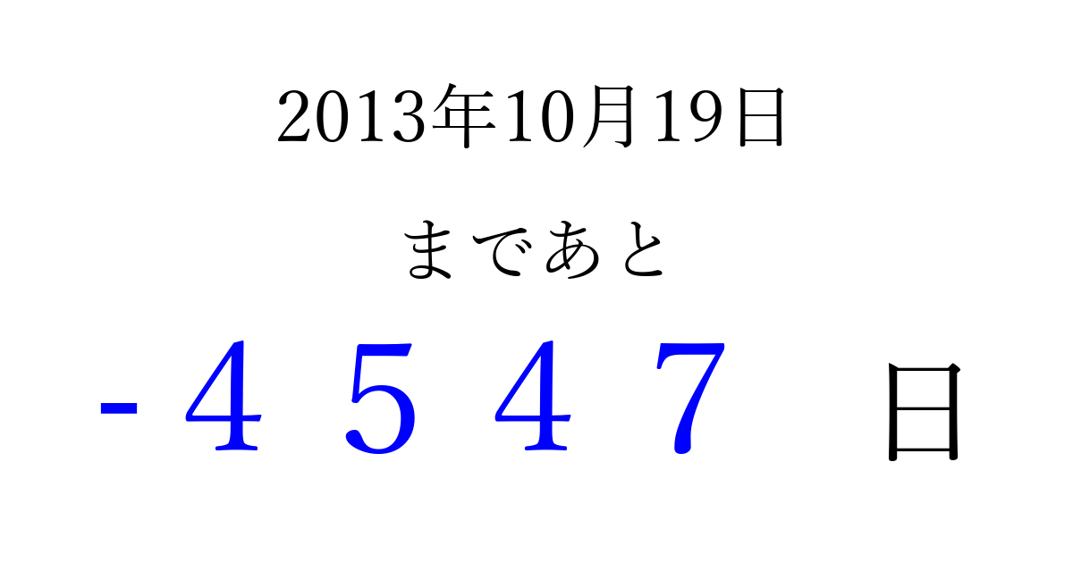 2013年10月19日(土)は もう 0000 日過ぎました 追加すると、トップページからすぐ選べるようになります ※2026/04/01現在の結果です。 最新の状態に更新する ↓シェアして、タイムライン上にカウントダウンを表示しよう!↓ 📤 この結果を共有する Tweet シェア Threads Bluesky 別の日付でカウントダウン 2013年10月のカレンダー このページをブックマークに追加すると、いつでもカウントダウンを確認できます。 (PC: Ctrl+D / Mac: ⌘+D) hitome-notes.comでは以下のページも運営しています。 指定日と期間から日付を計算 | ガチャ確率計算・シミュレーション | プライバシー・ポリシー 運営者:Avocado