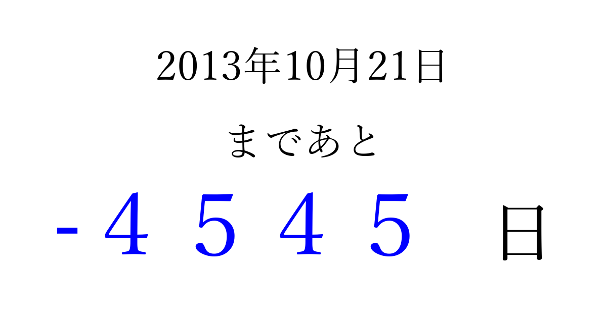 2013年10月21日(月)は もう 0000 日過ぎました 追加すると、トップページからすぐ選べるようになります ※2026/04/01現在の結果です。 最新の状態に更新する ↓シェアして、タイムライン上にカウントダウンを表示しよう!↓ 📤 この結果を共有する Tweet シェア Threads Bluesky 別の日付でカウントダウン 2013年10月のカレンダー このページをブックマークに追加すると、いつでもカウントダウンを確認できます。 (PC: Ctrl+D / Mac: ⌘+D) hitome-notes.comでは以下のページも運営しています。 指定日と期間から日付を計算 | ガチャ確率計算・シミュレーション | プライバシー・ポリシー 運営者:Avocado
