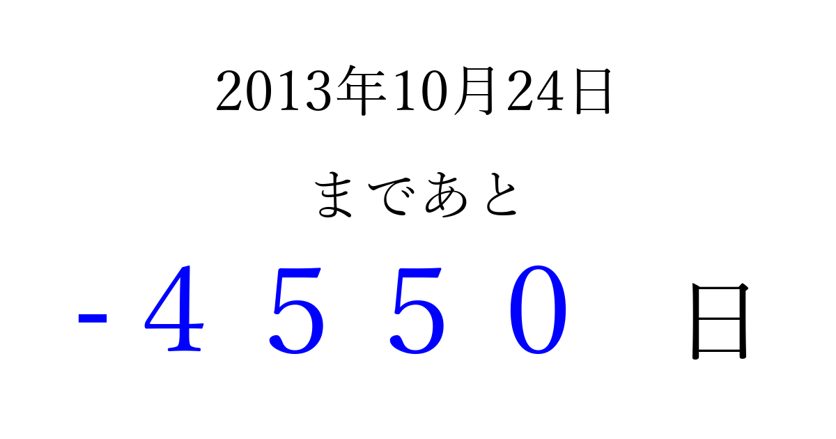 2013年10月24日(木)は もう 0000 日過ぎました 追加すると、トップページからすぐ選べるようになります ※2026/04/09現在の結果です。 最新の状態に更新する ↓シェアして、タイムライン上にカウントダウンを表示しよう!↓ 📤 この結果を共有する Tweet シェア Threads Bluesky 別の日付でカウントダウン 2013年10月のカレンダー このページをブックマークに追加すると、いつでもカウントダウンを確認できます。 (PC: Ctrl+D / Mac: ⌘+D) hitome-notes.comでは以下のページも運営しています。 指定日と期間から日付を計算 | ガチャ確率計算・シミュレーション | プライバシー・ポリシー 運営者:Avocado