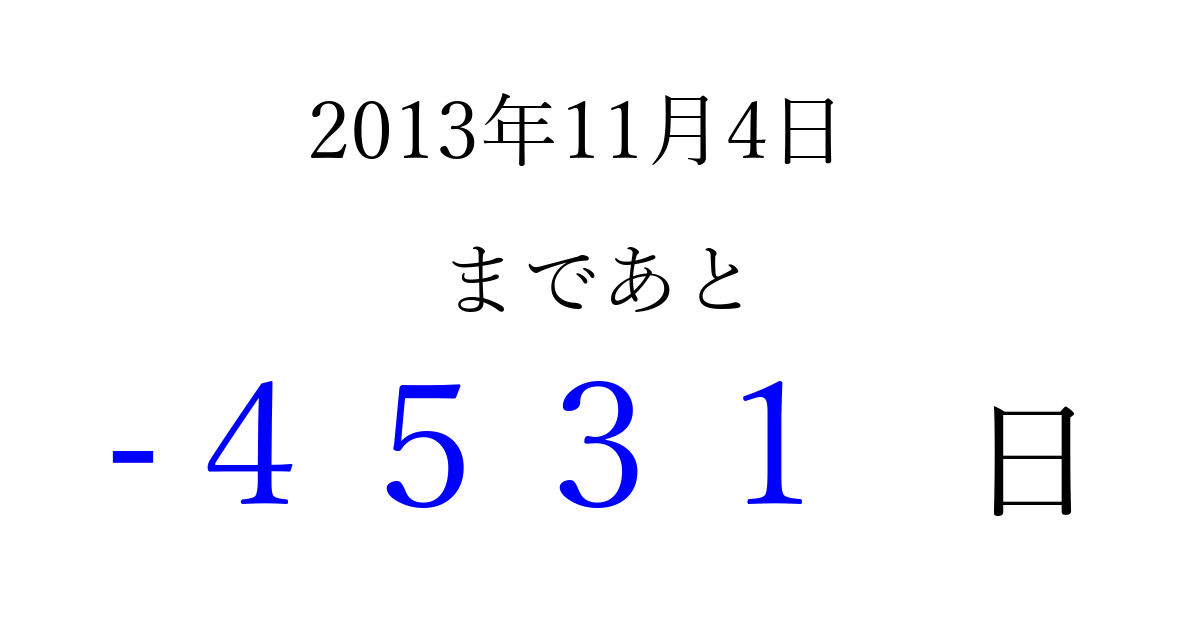 2013年11月4日(月)は もう 0000 日過ぎました 追加すると、トップページからすぐ選べるようになります ※2026/04/01現在の結果です。 最新の状態に更新する ↓シェアして、タイムライン上にカウントダウンを表示しよう!↓ 📤 この結果を共有する Tweet シェア Threads Bluesky 別の日付でカウントダウン 2013年11月のカレンダー このページをブックマークに追加すると、いつでもカウントダウンを確認できます。 (PC: Ctrl+D / Mac: ⌘+D) hitome-notes.comでは以下のページも運営しています。 指定日と期間から日付を計算 | ガチャ確率計算・シミュレーション | プライバシー・ポリシー 運営者:Avocado