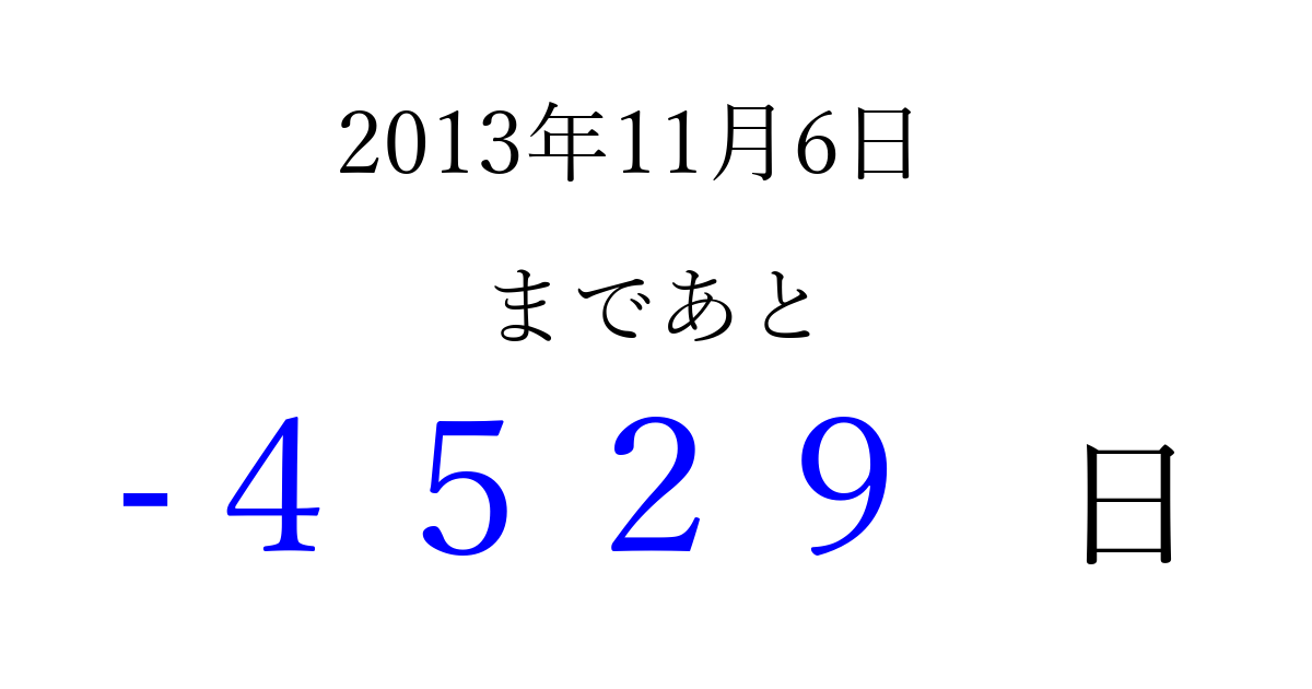2013年11月6日(水)は もう 0000 日過ぎました 追加すると、トップページからすぐ選べるようになります ※2026/04/01現在の結果です。 最新の状態に更新する ↓シェアして、タイムライン上にカウントダウンを表示しよう!↓ 📤 この結果を共有する Tweet シェア Threads Bluesky 別の日付でカウントダウン 2013年11月のカレンダー このページをブックマークに追加すると、いつでもカウントダウンを確認できます。 (PC: Ctrl+D / Mac: ⌘+D) hitome-notes.comでは以下のページも運営しています。 指定日と期間から日付を計算 | ガチャ確率計算・シミュレーション | プライバシー・ポリシー 運営者:Avocado