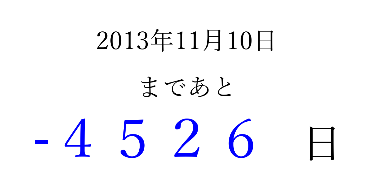 2013年11月10日(日)は もう 0000 日過ぎました 追加すると、トップページからすぐ選べるようになります ※2026/04/02現在の結果です。 最新の状態に更新する ↓シェアして、タイムライン上にカウントダウンを表示しよう!↓ 📤 この結果を共有する Tweet シェア Threads Bluesky 別の日付でカウントダウン 2013年11月のカレンダー このページをブックマークに追加すると、いつでもカウントダウンを確認できます。 (PC: Ctrl+D / Mac: ⌘+D) hitome-notes.comでは以下のページも運営しています。 指定日と期間から日付を計算 | ガチャ確率計算・シミュレーション | プライバシー・ポリシー 運営者:Avocado