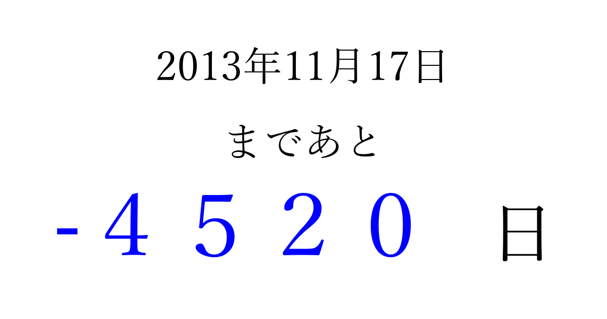 2013年11月17日(日)は もう 0000 日過ぎました 追加すると、トップページからすぐ選べるようになります ※2026/04/03現在の結果です。 最新の状態に更新する ↓シェアして、タイムライン上にカウントダウンを表示しよう!↓ 📤 この結果を共有する Tweet シェア Threads Bluesky 別の日付でカウントダウン 2013年11月のカレンダー このページをブックマークに追加すると、いつでもカウントダウンを確認できます。 (PC: Ctrl+D / Mac: ⌘+D) hitome-notes.comでは以下のページも運営しています。 指定日と期間から日付を計算 | ガチャ確率計算・シミュレーション | プライバシー・ポリシー 運営者:Avocado