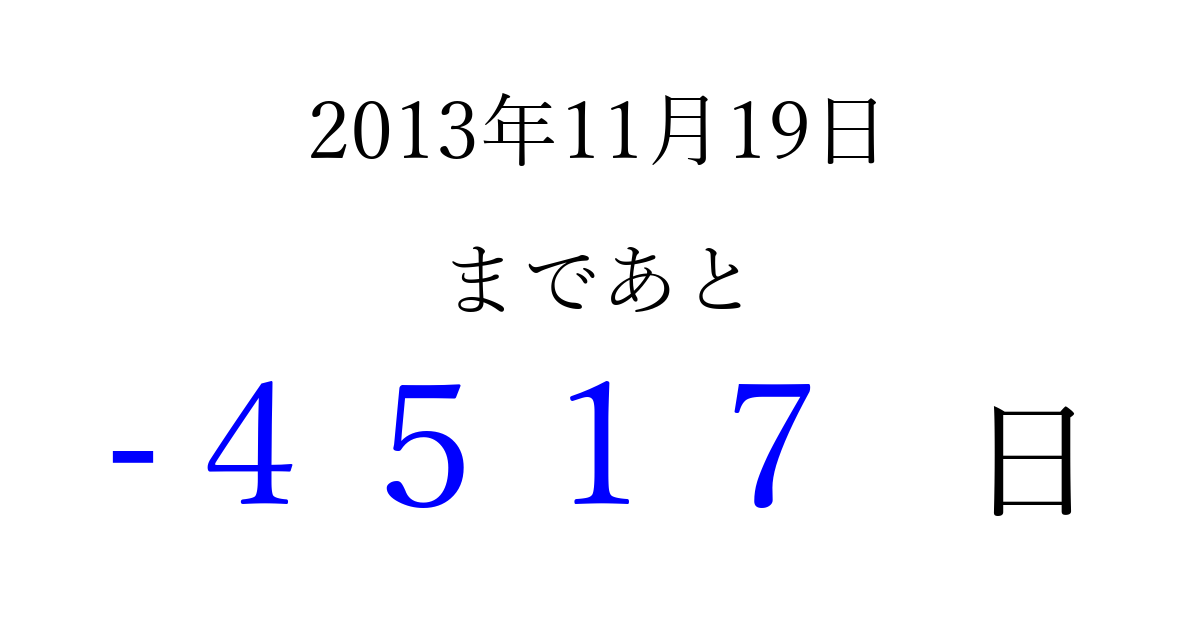 2013年11月19日(火)は もう 0000 日過ぎました 追加すると、トップページからすぐ選べるようになります ※2026/04/02現在の結果です。 最新の状態に更新する ↓シェアして、タイムライン上にカウントダウンを表示しよう!↓ 📤 この結果を共有する Tweet シェア Threads Bluesky 別の日付でカウントダウン 2013年11月のカレンダー このページをブックマークに追加すると、いつでもカウントダウンを確認できます。 (PC: Ctrl+D / Mac: ⌘+D) hitome-notes.comでは以下のページも運営しています。 指定日と期間から日付を計算 | ガチャ確率計算・シミュレーション | プライバシー・ポリシー 運営者:Avocado