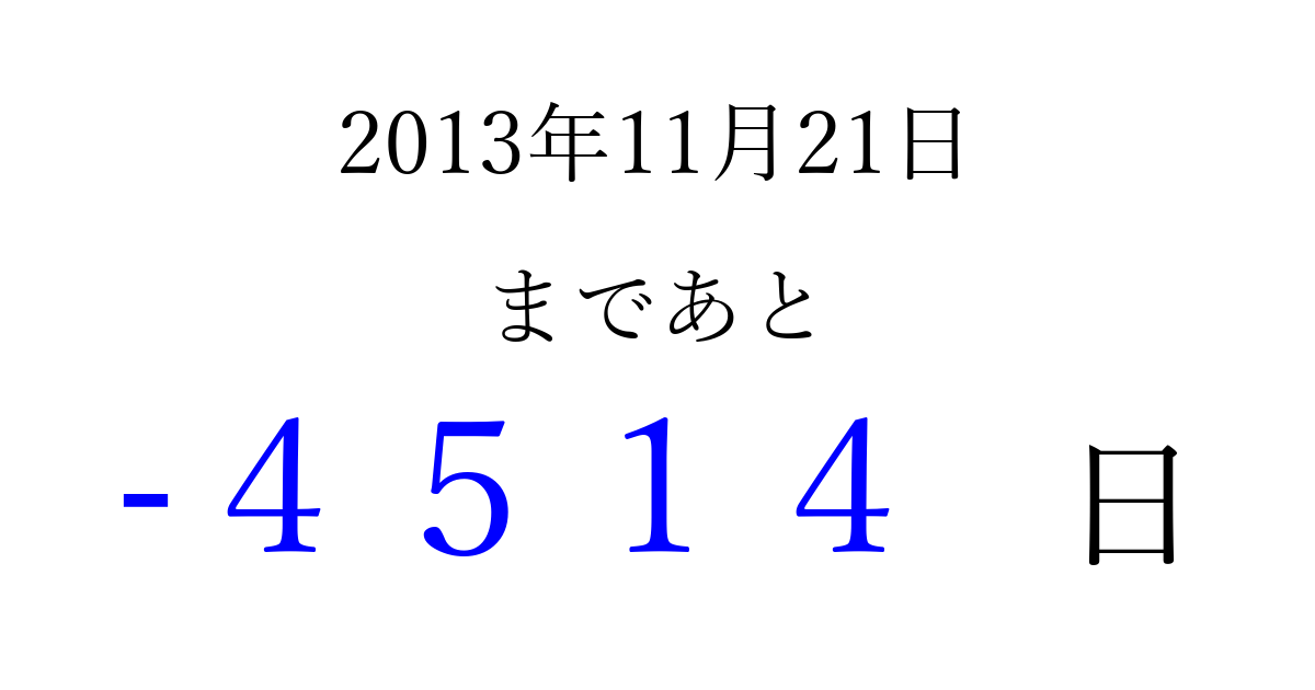 2013年11月21日(木)は もう 0000 日過ぎました 追加すると、トップページからすぐ選べるようになります ※2026/04/01現在の結果です。 最新の状態に更新する ↓シェアして、タイムライン上にカウントダウンを表示しよう!↓ 📤 この結果を共有する Tweet シェア Threads Bluesky 別の日付でカウントダウン 2013年11月のカレンダー このページをブックマークに追加すると、いつでもカウントダウンを確認できます。 (PC: Ctrl+D / Mac: ⌘+D) hitome-notes.comでは以下のページも運営しています。 指定日と期間から日付を計算 | ガチャ確率計算・シミュレーション | プライバシー・ポリシー 運営者:Avocado