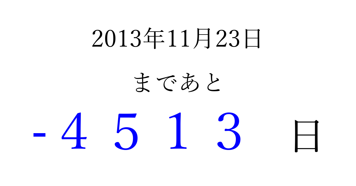 2013年11月23日(土)は もう 0000 日過ぎました 追加すると、トップページからすぐ選べるようになります ※2026/04/02現在の結果です。 最新の状態に更新する ↓シェアして、タイムライン上にカウントダウンを表示しよう!↓ 📤 この結果を共有する Tweet シェア Threads Bluesky 別の日付でカウントダウン 2013年11月のカレンダー このページをブックマークに追加すると、いつでもカウントダウンを確認できます。 (PC: Ctrl+D / Mac: ⌘+D) hitome-notes.comでは以下のページも運営しています。 指定日と期間から日付を計算 | ガチャ確率計算・シミュレーション | プライバシー・ポリシー 運営者:Avocado