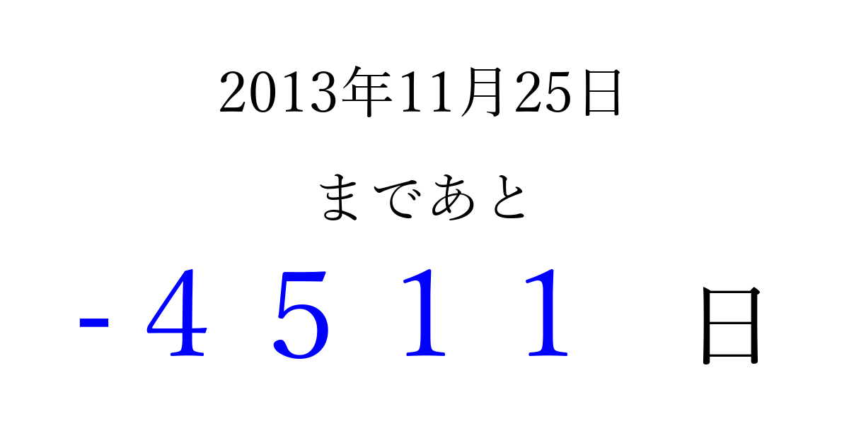 2013年11月25日(月)は もう 0000 日過ぎました 追加すると、トップページからすぐ選べるようになります ※2026/04/02現在の結果です。 最新の状態に更新する ↓シェアして、タイムライン上にカウントダウンを表示しよう!↓ 📤 この結果を共有する Tweet シェア Threads Bluesky 別の日付でカウントダウン 2013年11月のカレンダー このページをブックマークに追加すると、いつでもカウントダウンを確認できます。 (PC: Ctrl+D / Mac: ⌘+D) hitome-notes.comでは以下のページも運営しています。 指定日と期間から日付を計算 | ガチャ確率計算・シミュレーション | プライバシー・ポリシー 運営者:Avocado