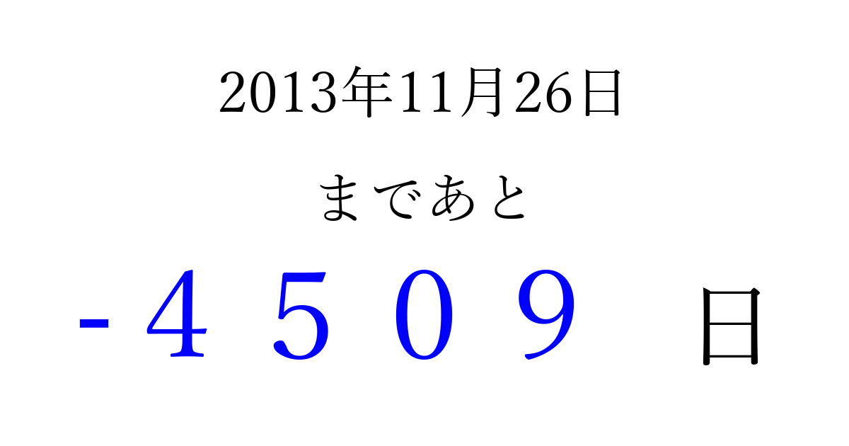 2013年11月26日(火)は もう 0000 日過ぎました 追加すると、トップページからすぐ選べるようになります ※2026/04/01現在の結果です。 最新の状態に更新する ↓シェアして、タイムライン上にカウントダウンを表示しよう!↓ 📤 この結果を共有する Tweet シェア Threads Bluesky 別の日付でカウントダウン 2013年11月のカレンダー このページをブックマークに追加すると、いつでもカウントダウンを確認できます。 (PC: Ctrl+D / Mac: ⌘+D) hitome-notes.comでは以下のページも運営しています。 指定日と期間から日付を計算 | ガチャ確率計算・シミュレーション | プライバシー・ポリシー 運営者:Avocado