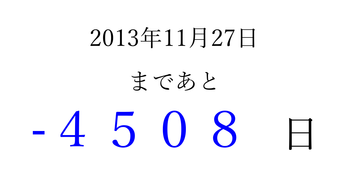 2013年11月27日(水)は もう 0000 日過ぎました 追加すると、トップページからすぐ選べるようになります ※2026/04/01現在の結果です。 最新の状態に更新する ↓シェアして、タイムライン上にカウントダウンを表示しよう!↓ 📤 この結果を共有する Tweet シェア Threads Bluesky 別の日付でカウントダウン 2013年11月のカレンダー このページをブックマークに追加すると、いつでもカウントダウンを確認できます。 (PC: Ctrl+D / Mac: ⌘+D) hitome-notes.comでは以下のページも運営しています。 指定日と期間から日付を計算 | ガチャ確率計算・シミュレーション | プライバシー・ポリシー 運営者:Avocado