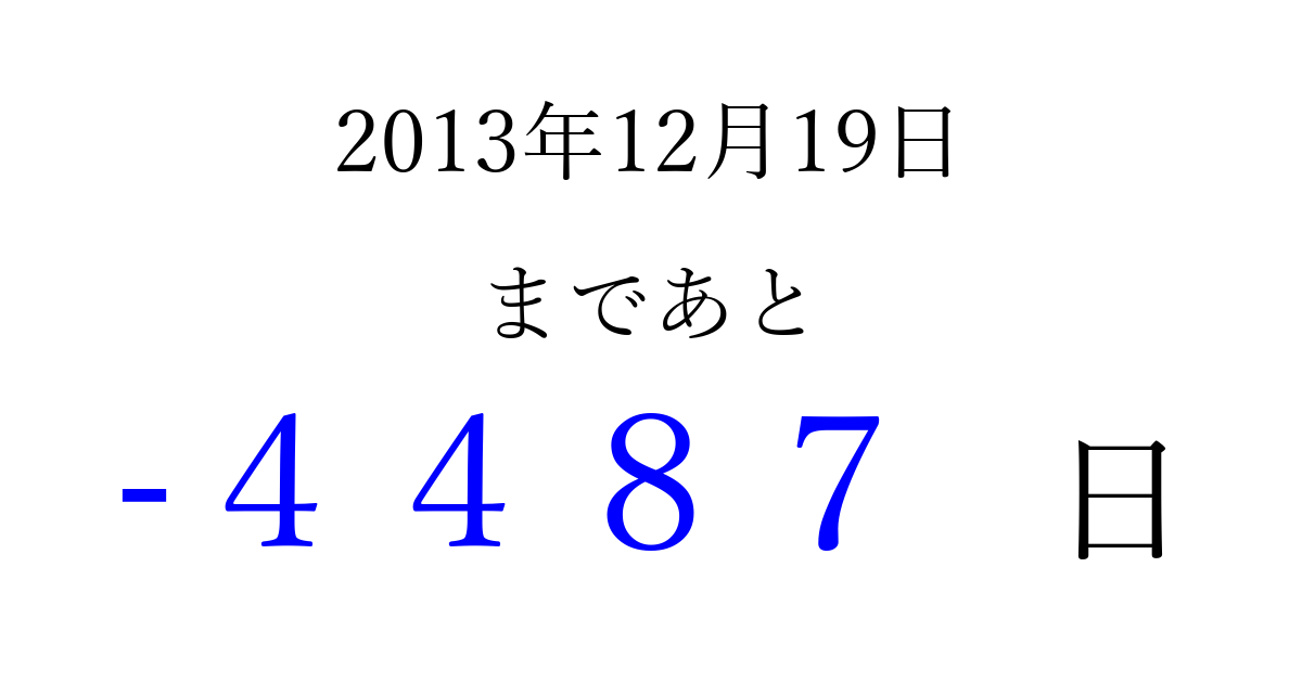 2013年12月19日(木)は もう 0000 日過ぎました 追加すると、トップページからすぐ選べるようになります ※2026/04/02現在の結果です。 最新の状態に更新する ↓シェアして、タイムライン上にカウントダウンを表示しよう!↓ 📤 この結果を共有する Tweet シェア Threads Bluesky 別の日付でカウントダウン 2013年12月のカレンダー このページをブックマークに追加すると、いつでもカウントダウンを確認できます。 (PC: Ctrl+D / Mac: ⌘+D) hitome-notes.comでは以下のページも運営しています。 指定日と期間から日付を計算 | ガチャ確率計算・シミュレーション | プライバシー・ポリシー 運営者:Avocado