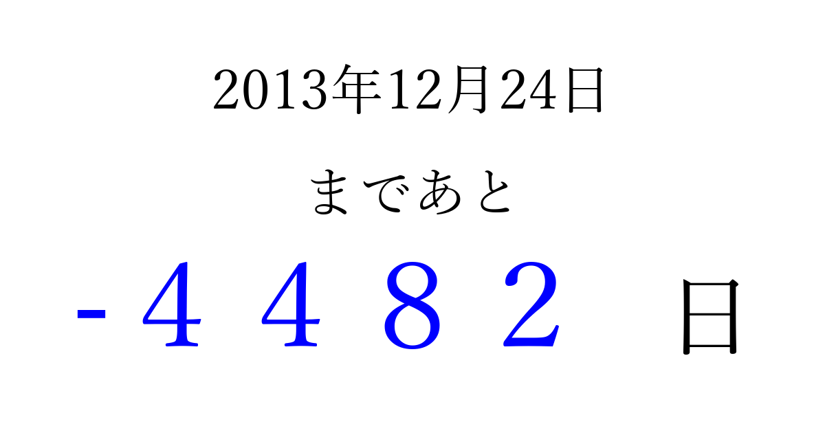 2013年12月24日(火)は もう 0000 日過ぎました 追加すると、トップページからすぐ選べるようになります ※2026/04/02現在の結果です。 最新の状態に更新する ↓シェアして、タイムライン上にカウントダウンを表示しよう!↓ 📤 この結果を共有する Tweet シェア Threads Bluesky 別の日付でカウントダウン 2013年12月のカレンダー このページをブックマークに追加すると、いつでもカウントダウンを確認できます。 (PC: Ctrl+D / Mac: ⌘+D) hitome-notes.comでは以下のページも運営しています。 指定日と期間から日付を計算 | ガチャ確率計算・シミュレーション | プライバシー・ポリシー 運営者:Avocado