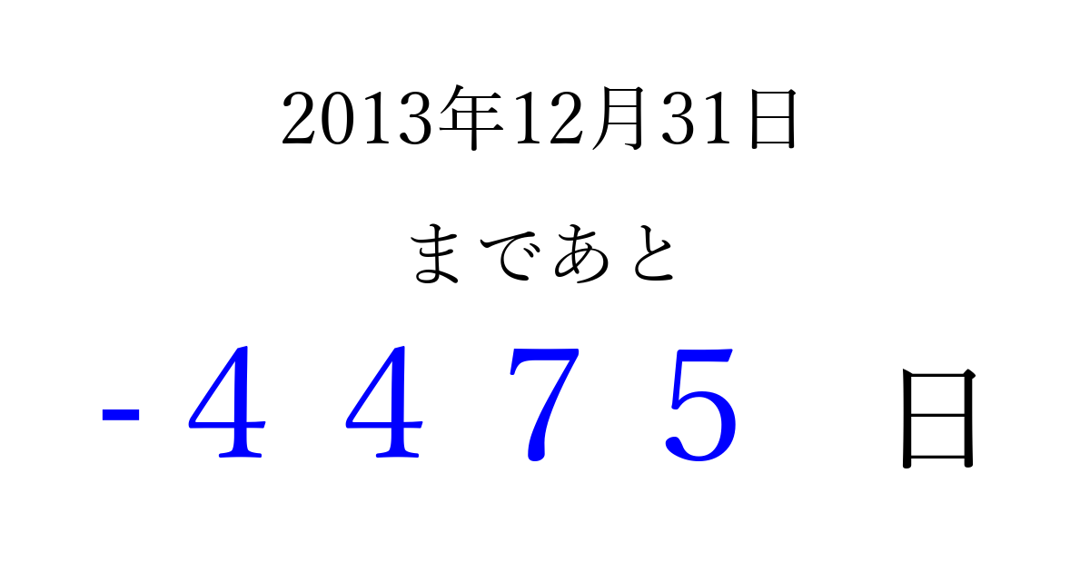 2013年12月31日(火)は もう 0000 日過ぎました 追加すると、トップページからすぐ選べるようになります ※2026/04/02現在の結果です。 最新の状態に更新する ↓シェアして、タイムライン上にカウントダウンを表示しよう!↓ 📤 この結果を共有する Tweet シェア Threads Bluesky 別の日付でカウントダウン 2013年12月のカレンダー このページをブックマークに追加すると、いつでもカウントダウンを確認できます。 (PC: Ctrl+D / Mac: ⌘+D) hitome-notes.comでは以下のページも運営しています。 指定日と期間から日付を計算 | ガチャ確率計算・シミュレーション | プライバシー・ポリシー 運営者:Avocado