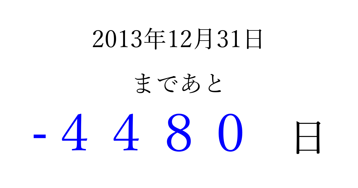 2013年12月31日(火)は もう 0000 日過ぎました 追加すると、トップページからすぐ選べるようになります ※2026/04/07現在の結果です。 最新の状態に更新する ↓シェアして、タイムライン上にカウントダウンを表示しよう!↓ 📤 この結果を共有する Tweet シェア Threads Bluesky 別の日付でカウントダウン 2013年12月のカレンダー このページをブックマークに追加すると、いつでもカウントダウンを確認できます。 (PC: Ctrl+D / Mac: ⌘+D) hitome-notes.comでは以下のページも運営しています。 指定日と期間から日付を計算 | ガチャ確率計算・シミュレーション | プライバシー・ポリシー 運営者:Avocado