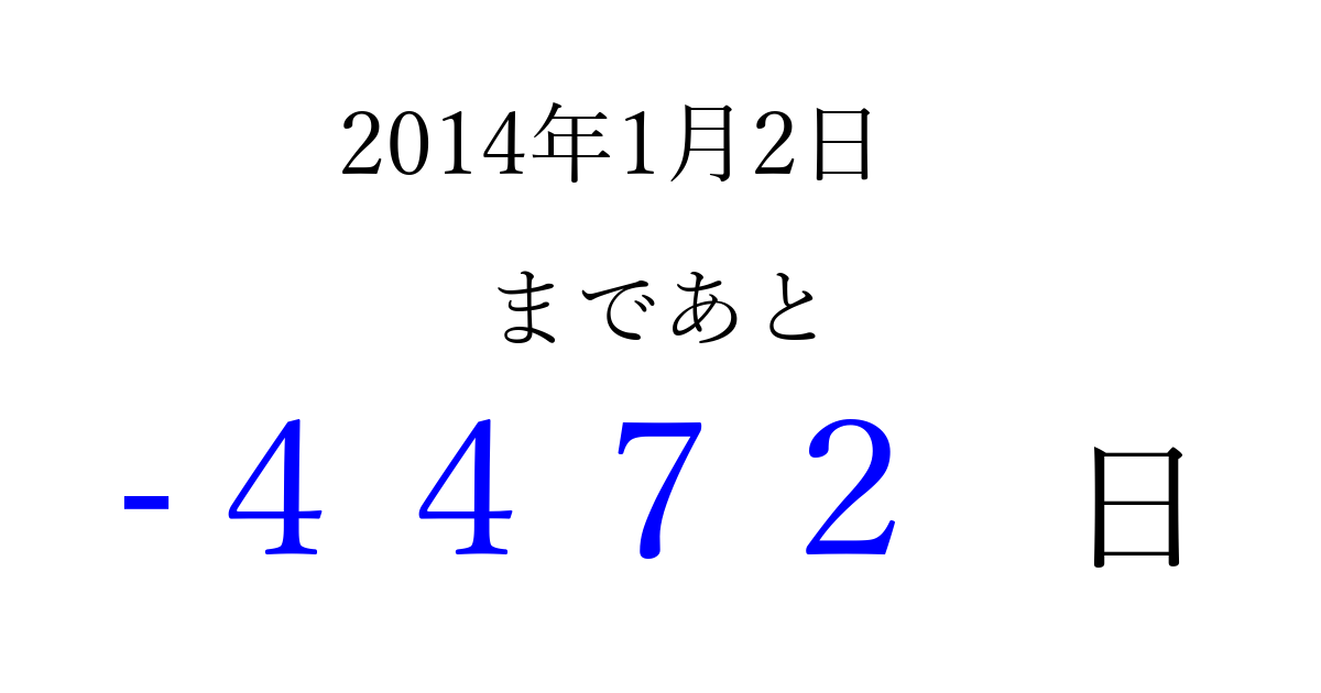 2014年1月2日(木)は もう 0000 日過ぎました 追加すると、トップページからすぐ選べるようになります ※2026/04/01現在の結果です。 最新の状態に更新する ↓シェアして、タイムライン上にカウントダウンを表示しよう!↓ 📤 この結果を共有する Tweet シェア Threads Bluesky 別の日付でカウントダウン 2014年1月のカレンダー このページをブックマークに追加すると、いつでもカウントダウンを確認できます。 (PC: Ctrl+D / Mac: ⌘+D) hitome-notes.comでは以下のページも運営しています。 指定日と期間から日付を計算 | ガチャ確率計算・シミュレーション | プライバシー・ポリシー 運営者:Avocado