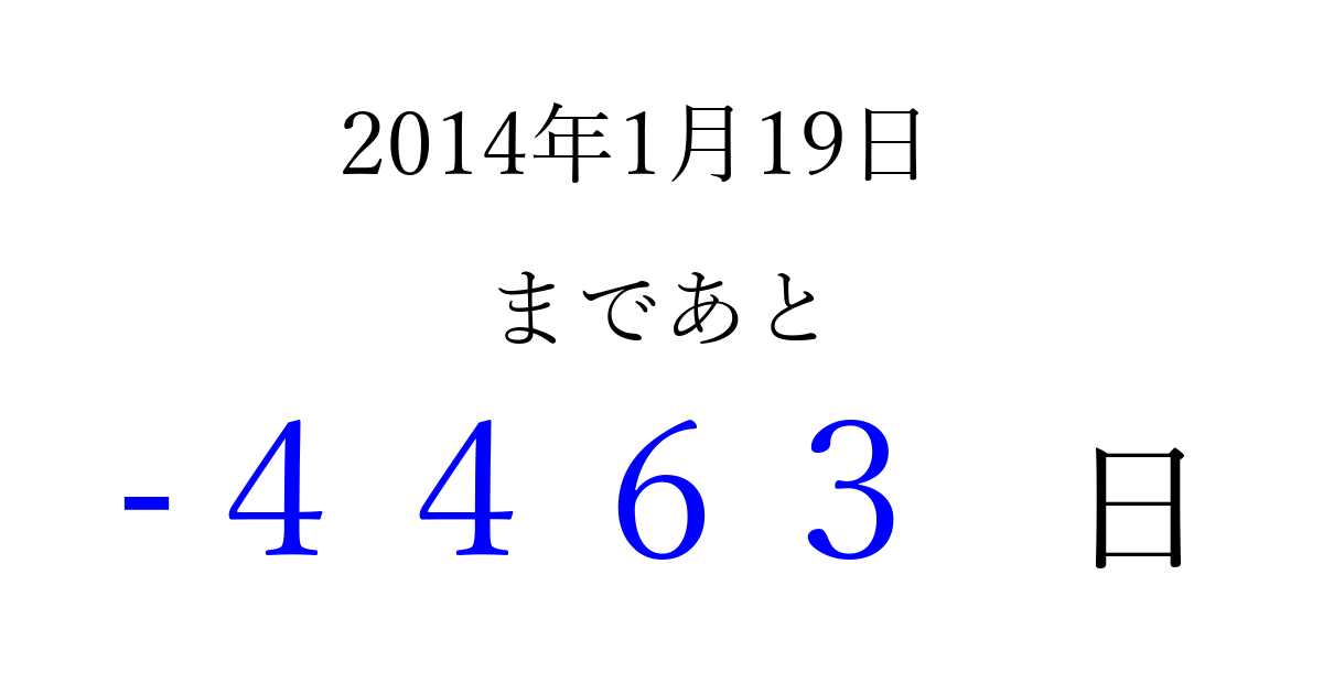 2014年1月19日(日)は もう 0000 日過ぎました 追加すると、トップページからすぐ選べるようになります ※2026/04/09現在の結果です。 最新の状態に更新する ↓シェアして、タイムライン上にカウントダウンを表示しよう!↓ 📤 この結果を共有する Tweet シェア Threads Bluesky 別の日付でカウントダウン 2014年1月のカレンダー このページをブックマークに追加すると、いつでもカウントダウンを確認できます。 (PC: Ctrl+D / Mac: ⌘+D) hitome-notes.comでは以下のページも運営しています。 指定日と期間から日付を計算 | ガチャ確率計算・シミュレーション | プライバシー・ポリシー 運営者:Avocado