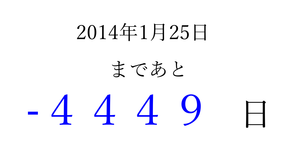 2014年1月25日(土)は もう 0000 日過ぎました 追加すると、トップページからすぐ選べるようになります ※2026/04/01現在の結果です。 最新の状態に更新する ↓シェアして、タイムライン上にカウントダウンを表示しよう!↓ 📤 この結果を共有する Tweet シェア Threads Bluesky 別の日付でカウントダウン 2014年1月のカレンダー このページをブックマークに追加すると、いつでもカウントダウンを確認できます。 (PC: Ctrl+D / Mac: ⌘+D) hitome-notes.comでは以下のページも運営しています。 指定日と期間から日付を計算 | ガチャ確率計算・シミュレーション | プライバシー・ポリシー 運営者:Avocado