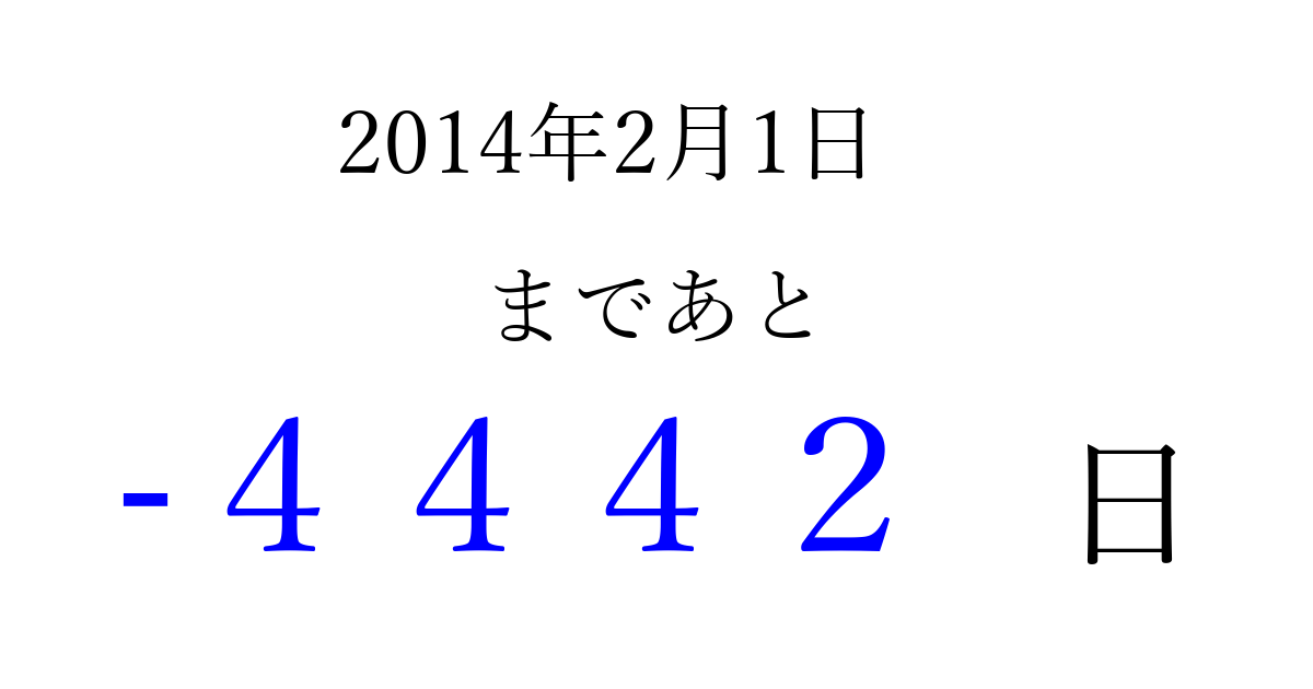 2014年2月1日(土)は もう 0000 日過ぎました 追加すると、トップページからすぐ選べるようになります ※2026/04/01現在の結果です。 最新の状態に更新する ↓シェアして、タイムライン上にカウントダウンを表示しよう!↓ 📤 この結果を共有する Tweet シェア Threads Bluesky 別の日付でカウントダウン 2014年2月のカレンダー このページをブックマークに追加すると、いつでもカウントダウンを確認できます。 (PC: Ctrl+D / Mac: ⌘+D) hitome-notes.comでは以下のページも運営しています。 指定日と期間から日付を計算 | ガチャ確率計算・シミュレーション | プライバシー・ポリシー 運営者:Avocado