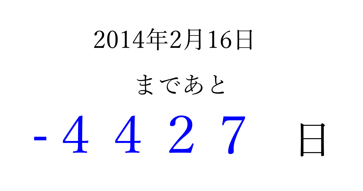 2014年2月16日(日)は もう 0000 日過ぎました 追加すると、トップページからすぐ選べるようになります ※2026/04/01現在の結果です。 最新の状態に更新する ↓シェアして、タイムライン上にカウントダウンを表示しよう!↓ 📤 この結果を共有する Tweet シェア Threads Bluesky 別の日付でカウントダウン 2014年2月のカレンダー このページをブックマークに追加すると、いつでもカウントダウンを確認できます。 (PC: Ctrl+D / Mac: ⌘+D) hitome-notes.comでは以下のページも運営しています。 指定日と期間から日付を計算 | ガチャ確率計算・シミュレーション | プライバシー・ポリシー 運営者:Avocado