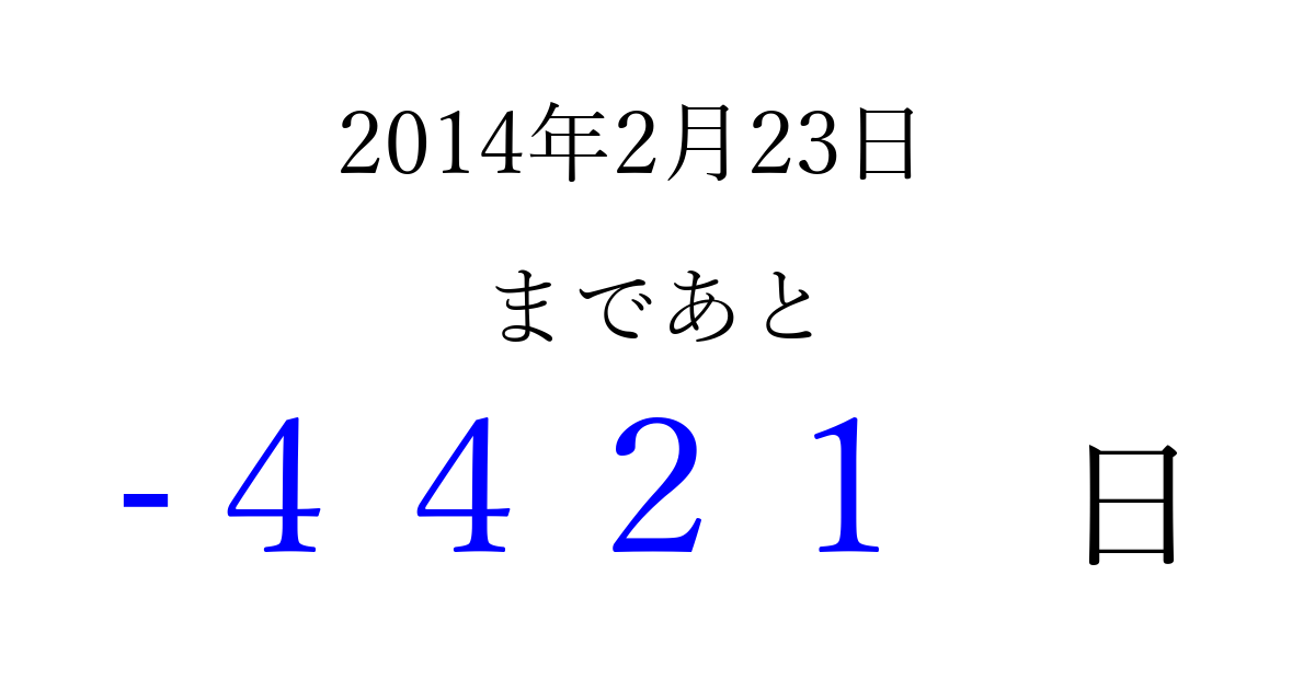 2014年2月23日(日)は もう 0000 日過ぎました 追加すると、トップページからすぐ選べるようになります ※2026/04/02現在の結果です。 最新の状態に更新する ↓シェアして、タイムライン上にカウントダウンを表示しよう!↓ 📤 この結果を共有する Tweet シェア Threads Bluesky 別の日付でカウントダウン 2014年2月のカレンダー このページをブックマークに追加すると、いつでもカウントダウンを確認できます。 (PC: Ctrl+D / Mac: ⌘+D) hitome-notes.comでは以下のページも運営しています。 指定日と期間から日付を計算 | ガチャ確率計算・シミュレーション | プライバシー・ポリシー 運営者:Avocado