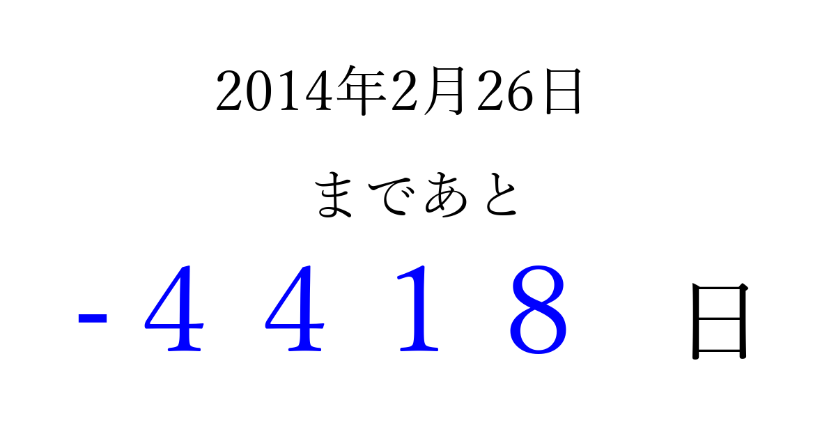 2014年2月26日(水)は もう 0000 日過ぎました 追加すると、トップページからすぐ選べるようになります ※2026/04/02現在の結果です。 最新の状態に更新する ↓シェアして、タイムライン上にカウントダウンを表示しよう!↓ 📤 この結果を共有する Tweet シェア Threads Bluesky 別の日付でカウントダウン 2014年2月のカレンダー このページをブックマークに追加すると、いつでもカウントダウンを確認できます。 (PC: Ctrl+D / Mac: ⌘+D) hitome-notes.comでは以下のページも運営しています。 指定日と期間から日付を計算 | ガチャ確率計算・シミュレーション | プライバシー・ポリシー 運営者:Avocado