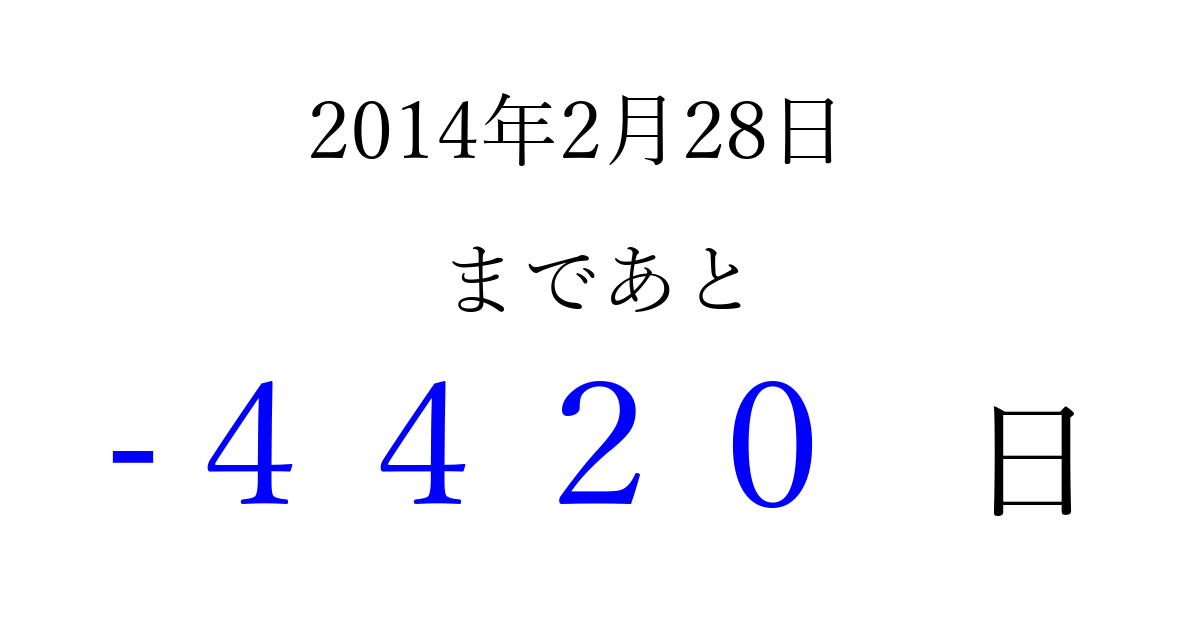 2014年2月28日(金)は もう 0000 日過ぎました 追加すると、トップページからすぐ選べるようになります ※2026/04/06現在の結果です。 最新の状態に更新する ↓シェアして、タイムライン上にカウントダウンを表示しよう!↓ 📤 この結果を共有する Tweet シェア Threads Bluesky 別の日付でカウントダウン 2014年2月のカレンダー このページをブックマークに追加すると、いつでもカウントダウンを確認できます。 (PC: Ctrl+D / Mac: ⌘+D) hitome-notes.comでは以下のページも運営しています。 指定日と期間から日付を計算 | ガチャ確率計算・シミュレーション | プライバシー・ポリシー 運営者:Avocado