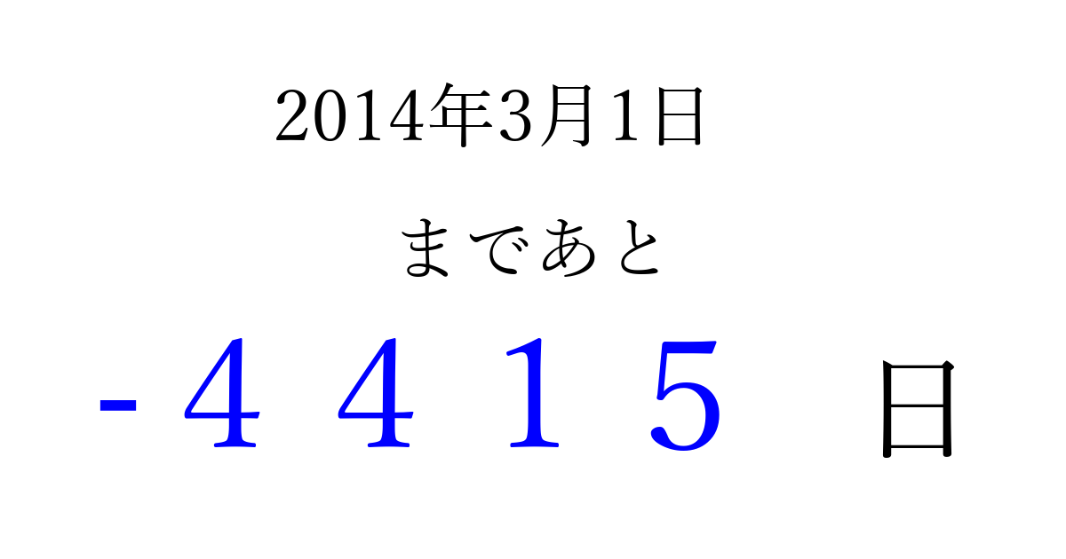 2014年3月1日(土)は もう 0000 日過ぎました 追加すると、トップページからすぐ選べるようになります ※2026/04/02現在の結果です。 最新の状態に更新する ↓シェアして、タイムライン上にカウントダウンを表示しよう!↓ 📤 この結果を共有する Tweet シェア Threads Bluesky 別の日付でカウントダウン 2014年3月のカレンダー このページをブックマークに追加すると、いつでもカウントダウンを確認できます。 (PC: Ctrl+D / Mac: ⌘+D) hitome-notes.comでは以下のページも運営しています。 指定日と期間から日付を計算 | ガチャ確率計算・シミュレーション | プライバシー・ポリシー 運営者:Avocado