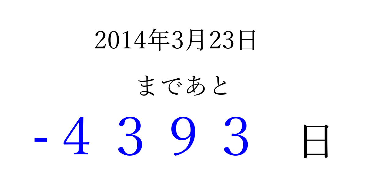 2014年3月23日(日)は もう 0000 日過ぎました 追加すると、トップページからすぐ選べるようになります ※2026/04/02現在の結果です。 最新の状態に更新する ↓シェアして、タイムライン上にカウントダウンを表示しよう!↓ 📤 この結果を共有する Tweet シェア Threads Bluesky 別の日付でカウントダウン 2014年3月のカレンダー このページをブックマークに追加すると、いつでもカウントダウンを確認できます。 (PC: Ctrl+D / Mac: ⌘+D) hitome-notes.comでは以下のページも運営しています。 指定日と期間から日付を計算 | ガチャ確率計算・シミュレーション | プライバシー・ポリシー 運営者:Avocado