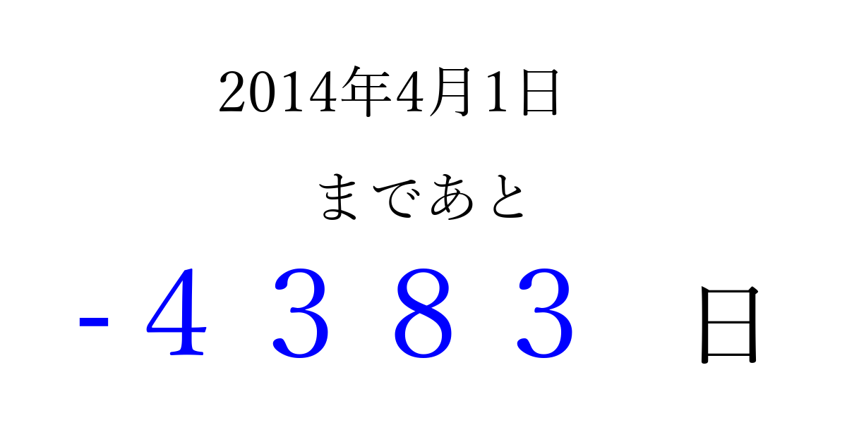 2014年4月1日(火)は もう 0000 日過ぎました 追加すると、トップページからすぐ選べるようになります ※2026/04/01現在の結果です。 最新の状態に更新する ↓シェアして、タイムライン上にカウントダウンを表示しよう!↓ 📤 この結果を共有する Tweet シェア Threads Bluesky 別の日付でカウントダウン 2014年4月のカレンダー このページをブックマークに追加すると、いつでもカウントダウンを確認できます。 (PC: Ctrl+D / Mac: ⌘+D) hitome-notes.comでは以下のページも運営しています。 指定日と期間から日付を計算 | ガチャ確率計算・シミュレーション | プライバシー・ポリシー 運営者:Avocado