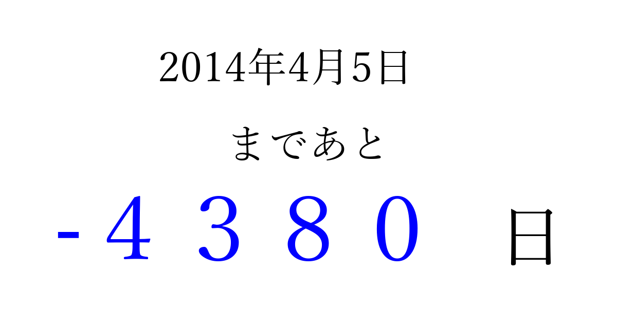 2014年4月5日(土)は もう 0000 日過ぎました 追加すると、トップページからすぐ選べるようになります ※2026/04/02現在の結果です。 最新の状態に更新する ↓シェアして、タイムライン上にカウントダウンを表示しよう!↓ 📤 この結果を共有する Tweet シェア Threads Bluesky 別の日付でカウントダウン 2014年4月のカレンダー このページをブックマークに追加すると、いつでもカウントダウンを確認できます。 (PC: Ctrl+D / Mac: ⌘+D) hitome-notes.comでは以下のページも運営しています。 指定日と期間から日付を計算 | ガチャ確率計算・シミュレーション | プライバシー・ポリシー 運営者:Avocado