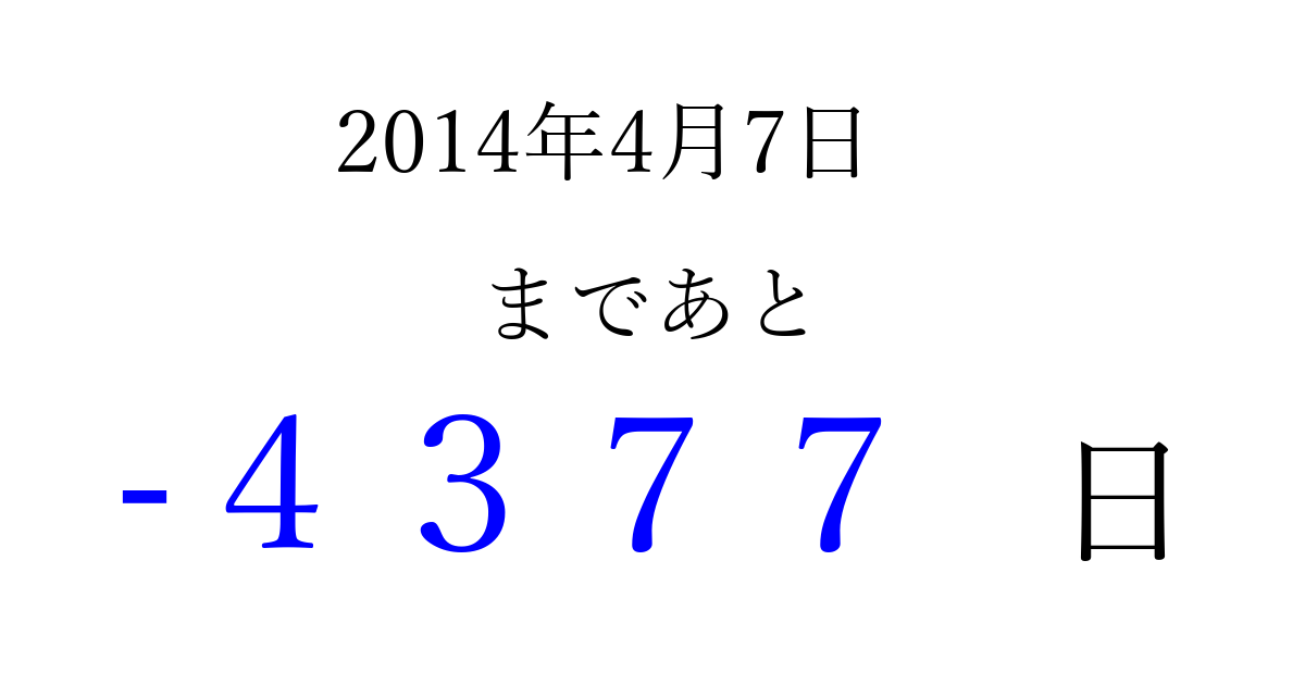 2014年4月7日(月)は もう 0000 日過ぎました 追加すると、トップページからすぐ選べるようになります ※2026/04/01現在の結果です。 最新の状態に更新する ↓シェアして、タイムライン上にカウントダウンを表示しよう!↓ 📤 この結果を共有する Tweet シェア Threads Bluesky 別の日付でカウントダウン 2014年4月のカレンダー このページをブックマークに追加すると、いつでもカウントダウンを確認できます。 (PC: Ctrl+D / Mac: ⌘+D) hitome-notes.comでは以下のページも運営しています。 指定日と期間から日付を計算 | ガチャ確率計算・シミュレーション | プライバシー・ポリシー 運営者:Avocado