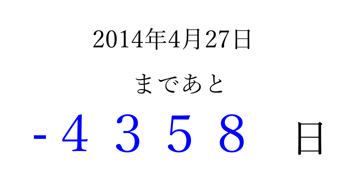 2014年4月27日(日)は もう 0000 日過ぎました 追加すると、トップページからすぐ選べるようになります ※2026/04/02現在の結果です。 最新の状態に更新する ↓シェアして、タイムライン上にカウントダウンを表示しよう!↓ 📤 この結果を共有する Tweet シェア Threads Bluesky 別の日付でカウントダウン 2014年4月のカレンダー このページをブックマークに追加すると、いつでもカウントダウンを確認できます。 (PC: Ctrl+D / Mac: ⌘+D) hitome-notes.comでは以下のページも運営しています。 指定日と期間から日付を計算 | ガチャ確率計算・シミュレーション | プライバシー・ポリシー 運営者:Avocado