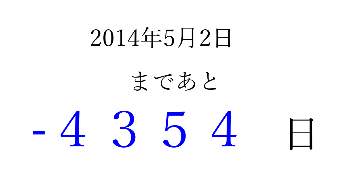 2014年5月2日(金)は もう 0000 日過ぎました 追加すると、トップページからすぐ選べるようになります ※2026/04/03現在の結果です。 最新の状態に更新する ↓シェアして、タイムライン上にカウントダウンを表示しよう!↓ 📤 この結果を共有する Tweet シェア Threads Bluesky 別の日付でカウントダウン 2014年5月のカレンダー このページをブックマークに追加すると、いつでもカウントダウンを確認できます。 (PC: Ctrl+D / Mac: ⌘+D) hitome-notes.comでは以下のページも運営しています。 指定日と期間から日付を計算 | ガチャ確率計算・シミュレーション | プライバシー・ポリシー 運営者:Avocado