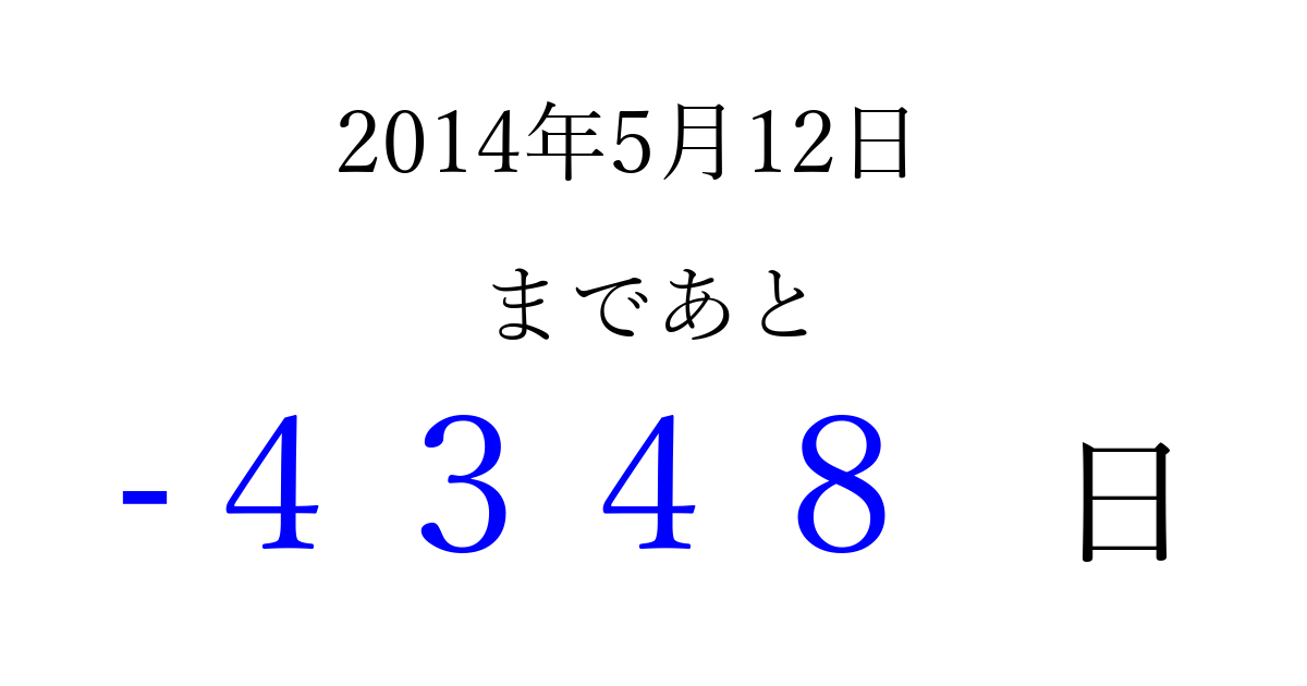 2014年5月12日(月)は もう 0000 日過ぎました 追加すると、トップページからすぐ選べるようになります ※2026/04/07現在の結果です。 最新の状態に更新する ↓シェアして、タイムライン上にカウントダウンを表示しよう!↓ 📤 この結果を共有する Tweet シェア Threads Bluesky 別の日付でカウントダウン 2014年5月のカレンダー このページをブックマークに追加すると、いつでもカウントダウンを確認できます。 (PC: Ctrl+D / Mac: ⌘+D) hitome-notes.comでは以下のページも運営しています。 指定日と期間から日付を計算 | ガチャ確率計算・シミュレーション | プライバシー・ポリシー 運営者:Avocado