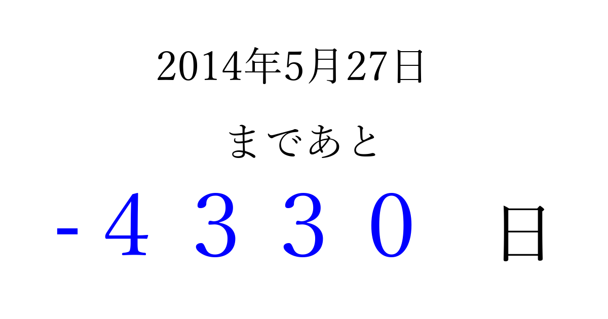2014年5月27日(火)は もう 0000 日過ぎました 追加すると、トップページからすぐ選べるようになります ※2026/04/04現在の結果です。 最新の状態に更新する ↓シェアして、タイムライン上にカウントダウンを表示しよう!↓ 📤 この結果を共有する Tweet シェア Threads Bluesky 別の日付でカウントダウン 2014年5月のカレンダー このページをブックマークに追加すると、いつでもカウントダウンを確認できます。 (PC: Ctrl+D / Mac: ⌘+D) hitome-notes.comでは以下のページも運営しています。 指定日と期間から日付を計算 | ガチャ確率計算・シミュレーション | プライバシー・ポリシー 運営者:Avocado